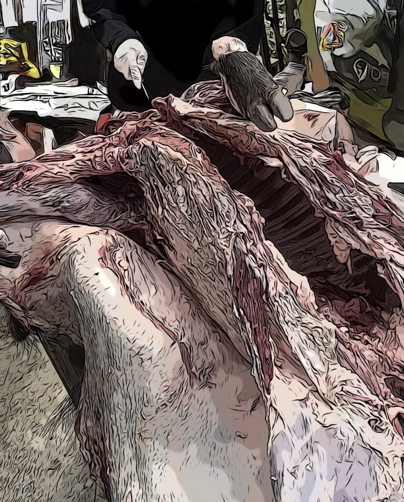 解体していて、猪には“ヨロイ”といわれる非常に硬い脂肪層があることをはじめて知りました。これは首周りから肩、そして胸の前方にあり、ゴム板のように硬いものでした。